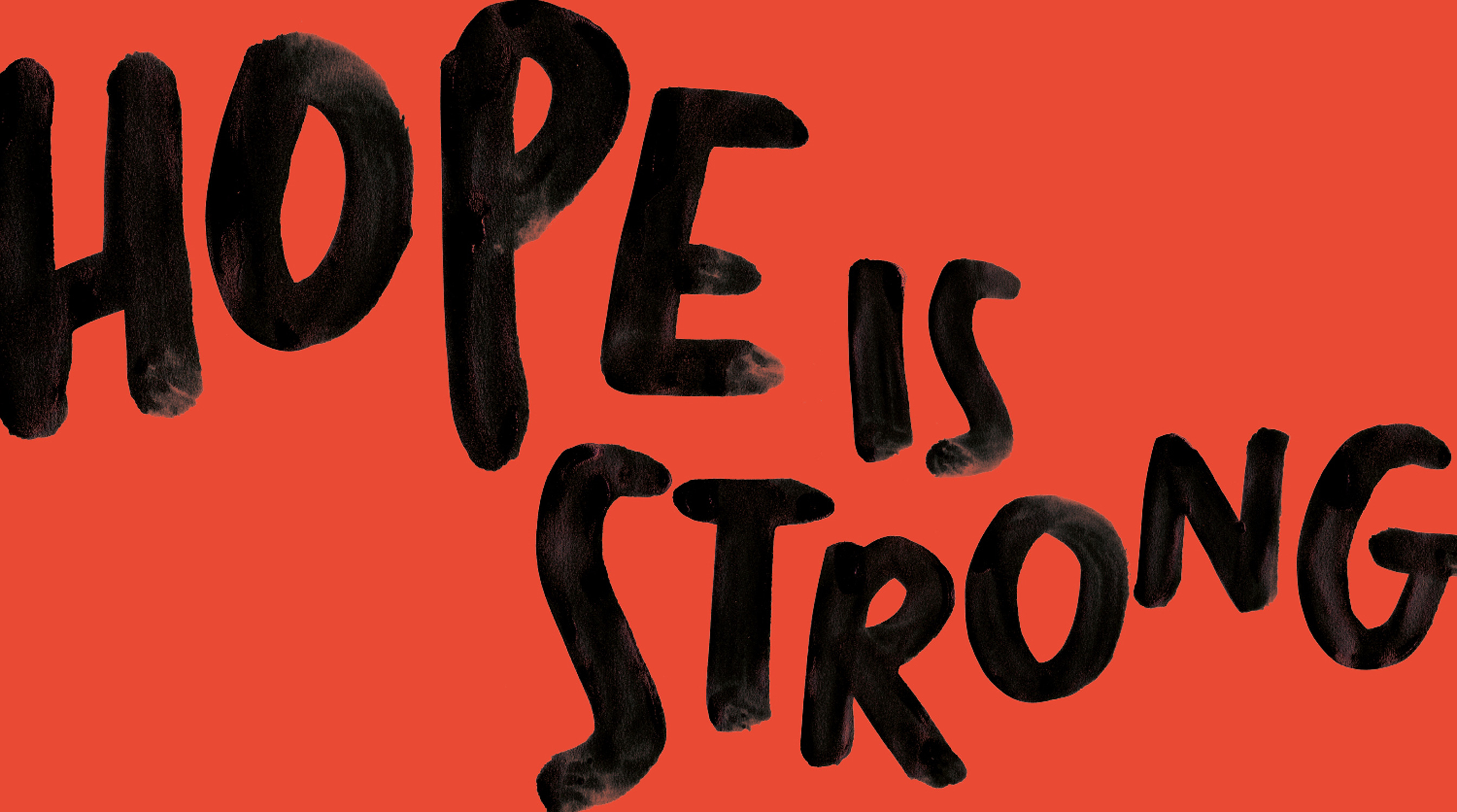 From the off, Hope is Strong is a very different type of exhibition. The promotional posters look as though they have been pulled straight off a placard; the artwork title cards are backed on red rather than traditional white; a jukebox plays protest songs loudly into the space; there are bean bags to lounge on; and on stepping over the threshold, the viewer is immediately greeted by six taxidermy foxes in red hats carrying books by Karl Marx.