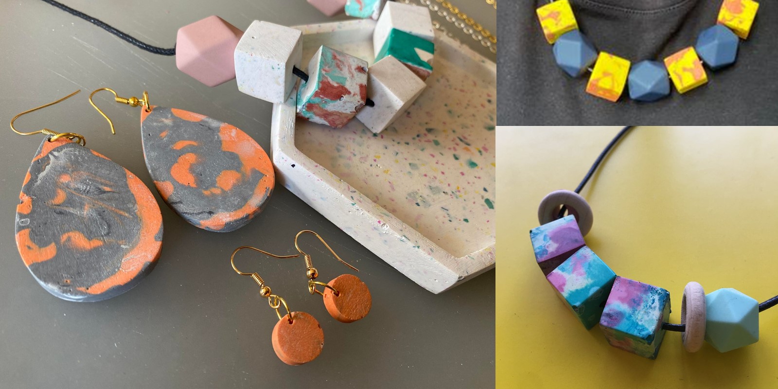 Create your own jesmonite jewellery including handmade beads, necklaces, earrings, brooches and more with artist and maker, Kim Searle, using a variety of geometric and recycled moulds.