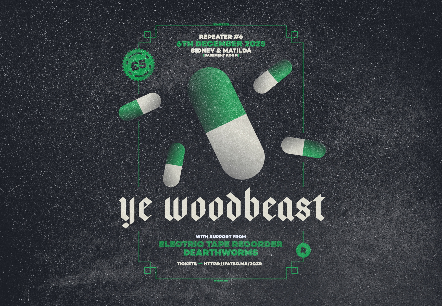 Repeater #6 returns to prescribe its final dose of the year, expect queasy doses of unease and unrest in equal measure. Saturday 6th December we'll be lurking in the basement room of Sidney & Matilda ready to medicate your ears with sounds from Sheffield's favourite sons and daughters: Ye Woodbeast, Electric Tape Recorder and Dearthworms.