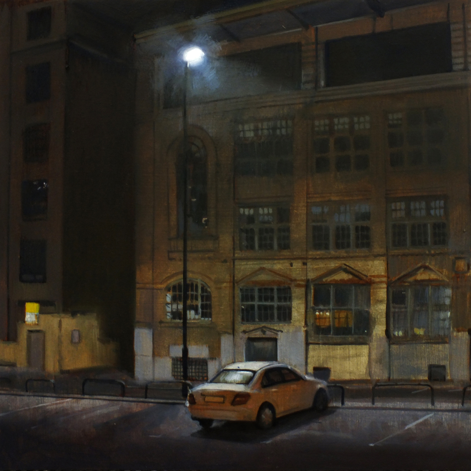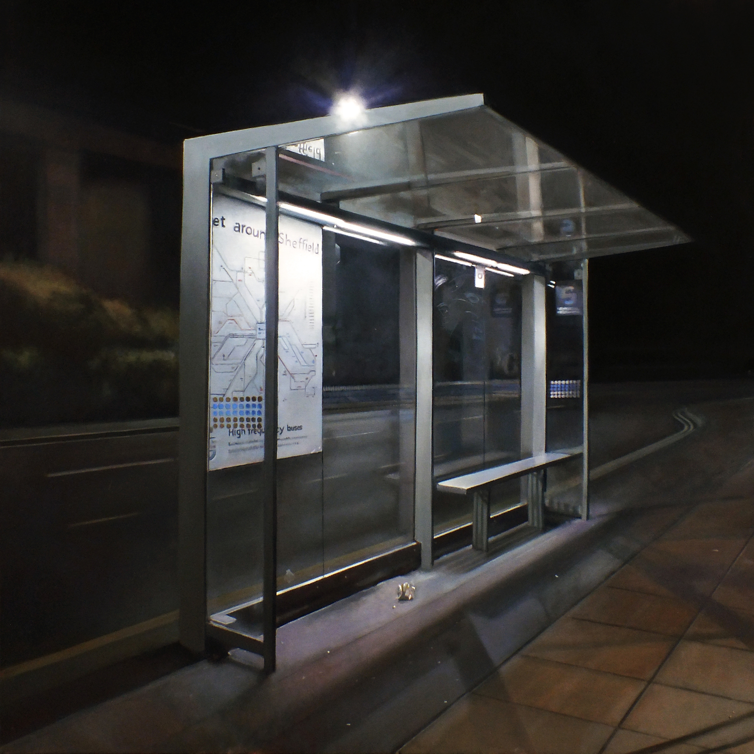 The images I choose to paint are collected from many walks that I've done over the past few years – wandering through the city streets and looking for spaces and places seeing that somehow impinge on me. Seeing if some places or spaces have a tension (bit of a hard term to describe). Basically I'm looking for things that have something mysterious about them without knowing why. I'm not interested in beauty or something being 'cool'. It could be something strange about a light, a bus stop (I paint many bus stops), a building, a car park, anything really. These things are usually very normal and everyday but for a moment, often accentuated by the shadows and lights of night, there's something else going on. They become different. That's the point I'm interested in and I take a photo. After taking the photograph I'll consciously try not to think about what I've just seen until I start considering painting. It's a big element for me that, when I start painting, I start constructing some semblance of meaning of what's in the painting at the same time as I construct the work. To my mind it's what keeps me engaged with the work.