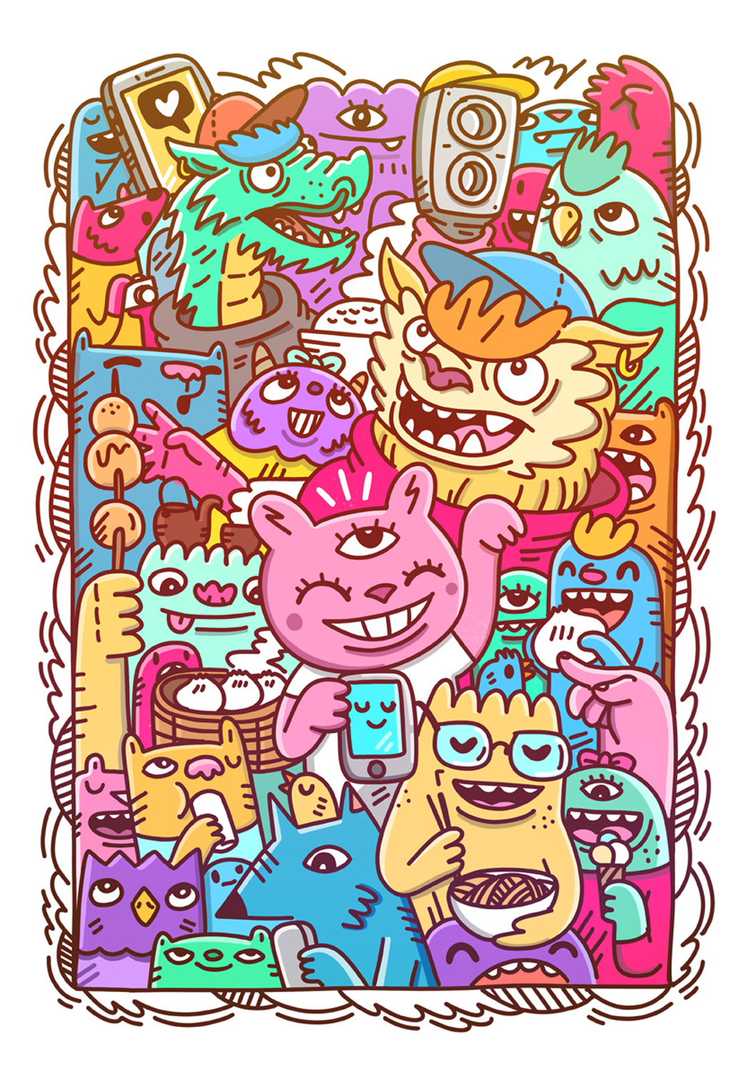 I’ve been working on an exciting piece for a new Asian food market called Oisoi Oriental Market. It’s a 13-metre feature mural with plenty of colour, character and narrative to sink your eyes into. It’s one of my most colourful mural works – I tend to keep colour to a minimum but this was a case where the client wanted to use a wider palette and I felt obliged to take up the challenge. Other than that I’ve been teaching part time at Sheffield Hallam University across Illustration and Digital Media Production as well as working on personal doodle works and occasional commissions that are building up in the background.