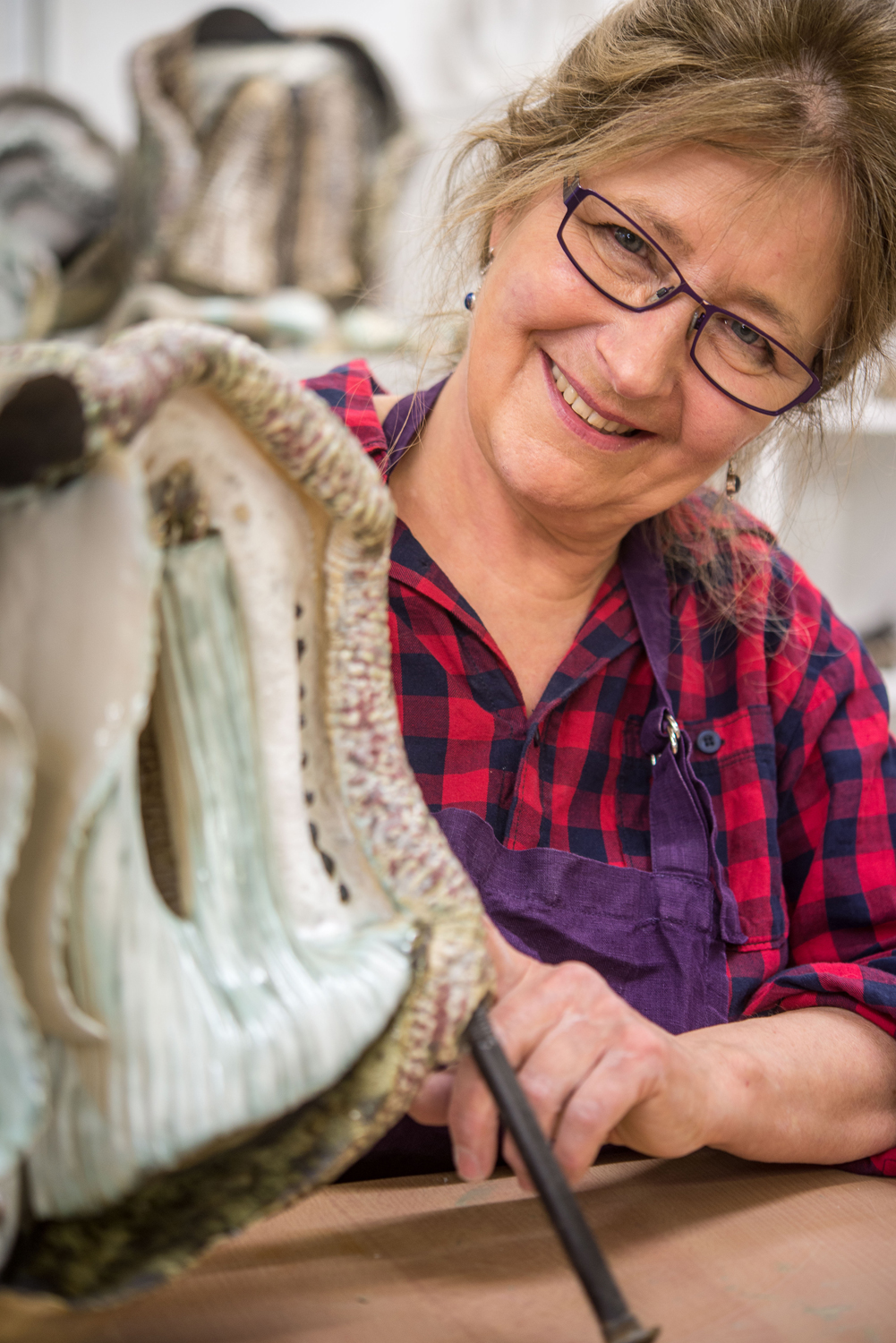 An artist working with clay to capture organic textures and movements in abstract sculptures and vessels.