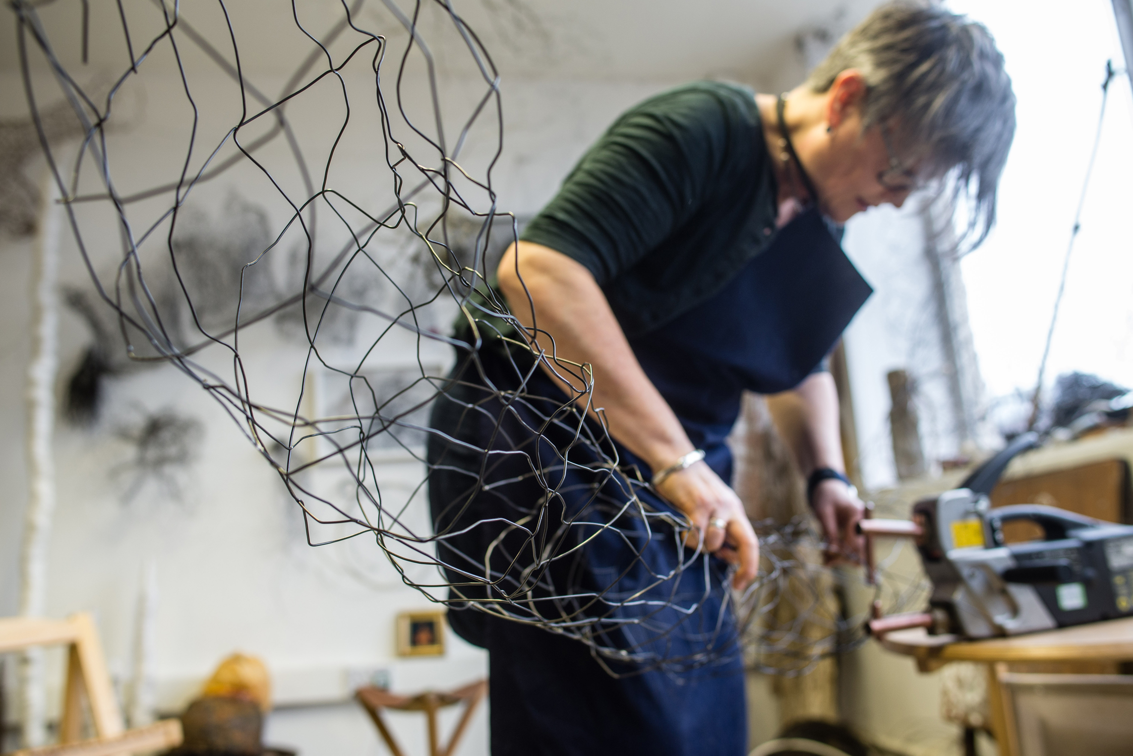 A sculptor working with wire, welding and weaving it into ethereal forms and bringing in light and sound to create immersive installations.