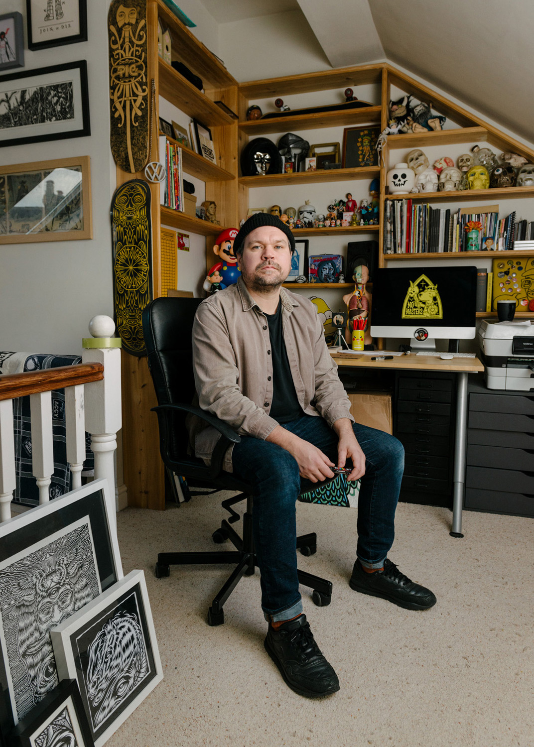 One of the most distinctive illustrators in town, with a back catalogue of creepy creatures and writhing skulls.