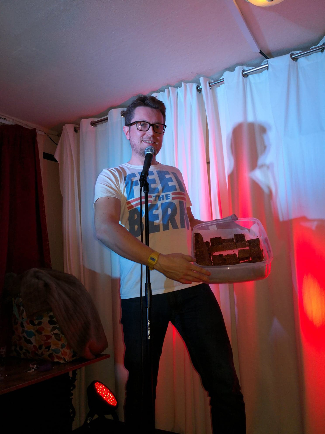 I would describe my 'work' before that point as absorbing a working knowledge of the broad range of elements of the comedy circuit, both its professional and amateur components, and asking them to perform. I try to book acts who you might not otherwise see around these parts, or not very often. Oh, and I bake cake. I also host/MC/compere the nights with varying degrees of success. Sometimes it really works, of a fashion, but I think I do suffer from the fact that I don't gig regularly anymore.