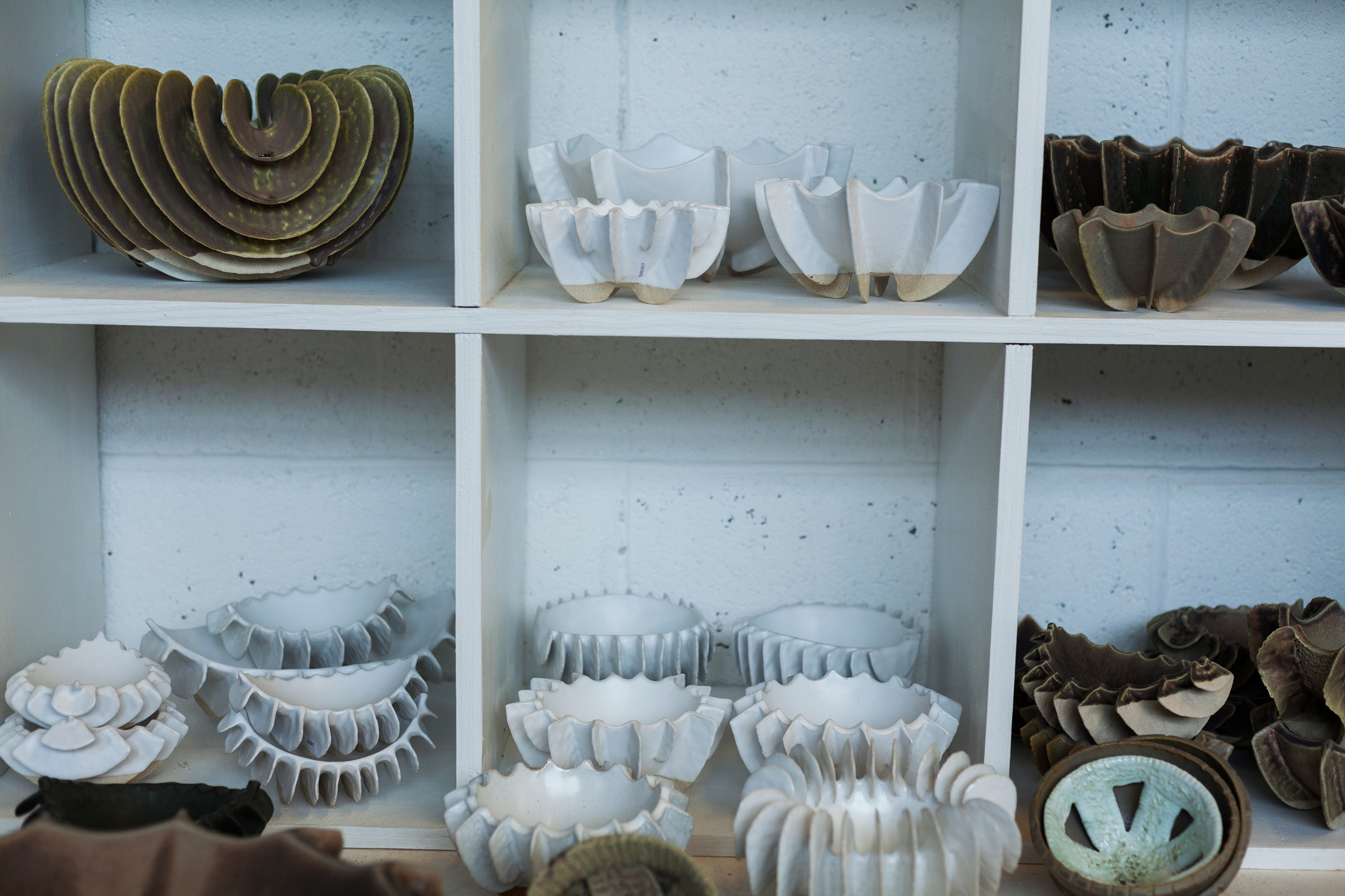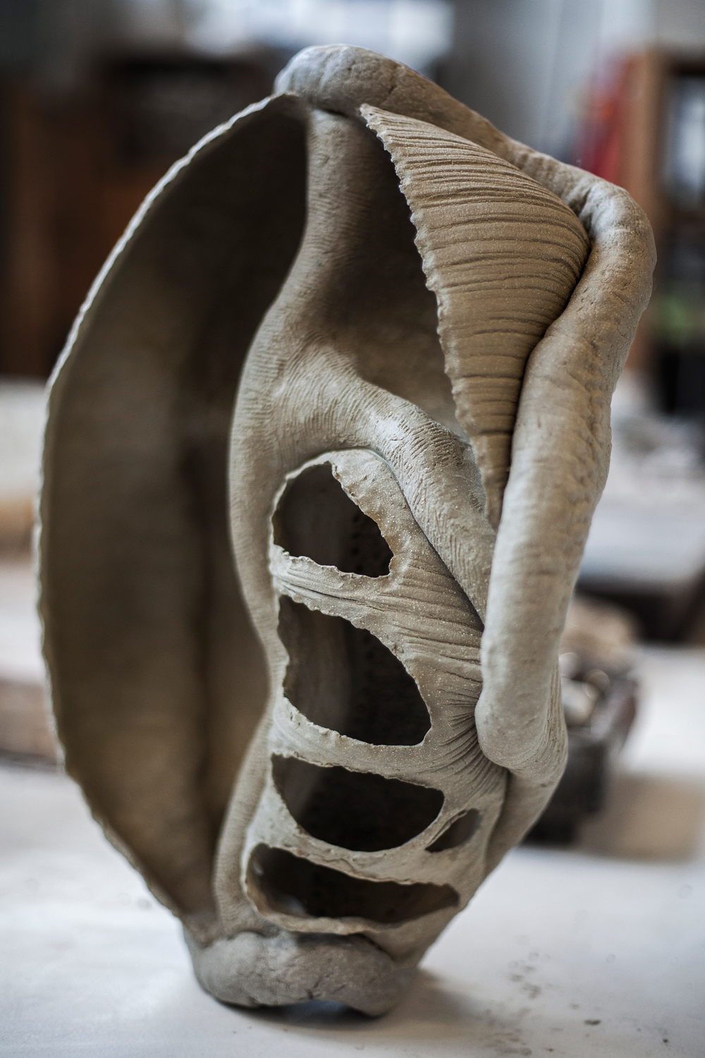 I’m a hand-builder in clay, making abstract sculpture and vessel forms. I try to capture the essence of the organic to make things that looked formed in nature, that might be found objects, dug up at the seashore. The work is very organic – highly textured slabs create both a sense of movement and softness in a hard material; repetitive fins give the impression that the piece might scuttle off.
