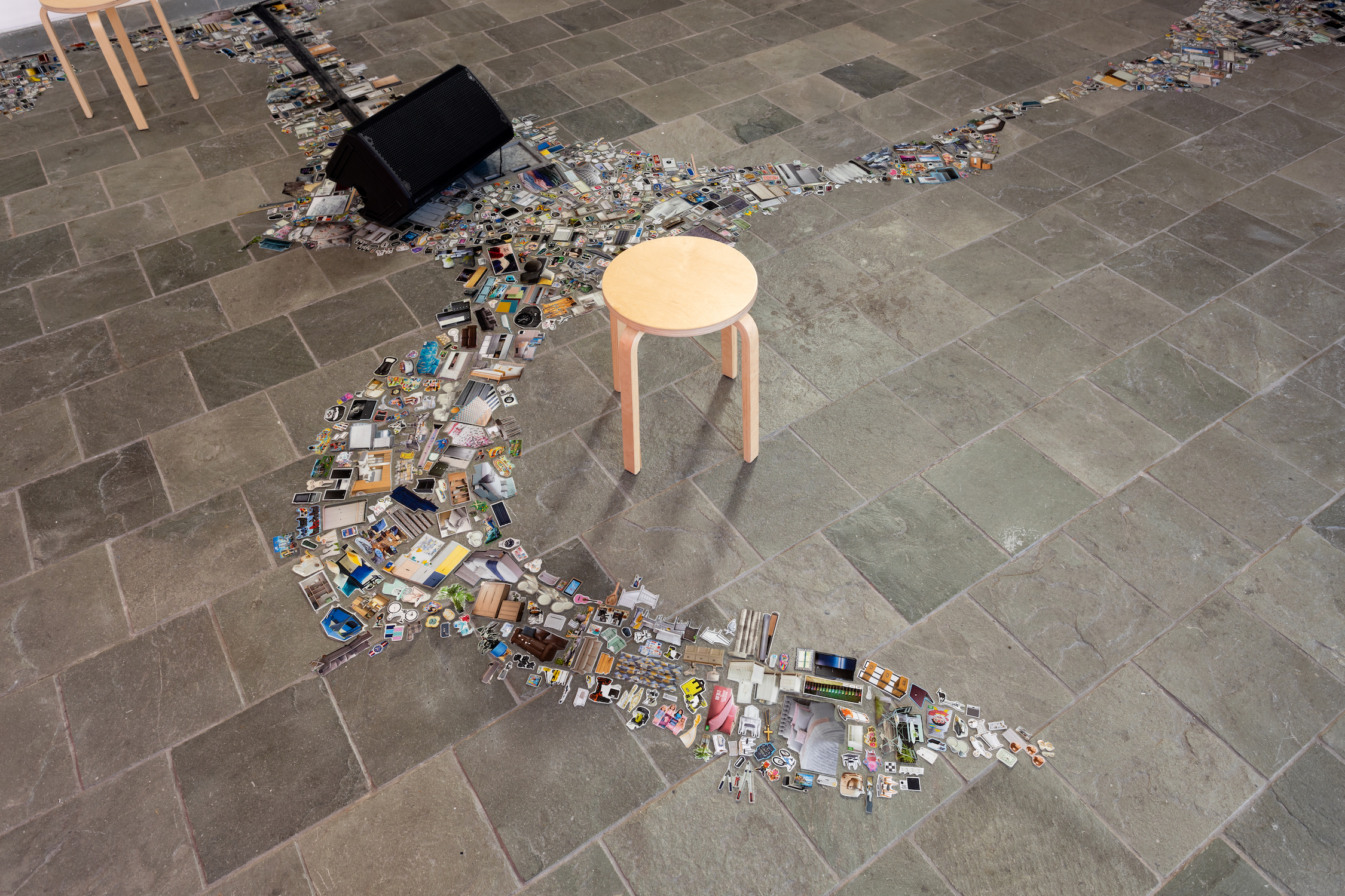 I collect things from my everyday life and rearrange them to talk about my life experience or topics that I’m interested in. I often outsource things that need making, because I would rather dip in and out of different materials to say lots of different things, than learn the skill of a craft. I want to redefine who and what gets monumentalised, by reframing, playing with and celebrating the mundane, normal and ordinary. At the moment, I am really interested in mixing ready-made found objects with time-based new media like sound and video.