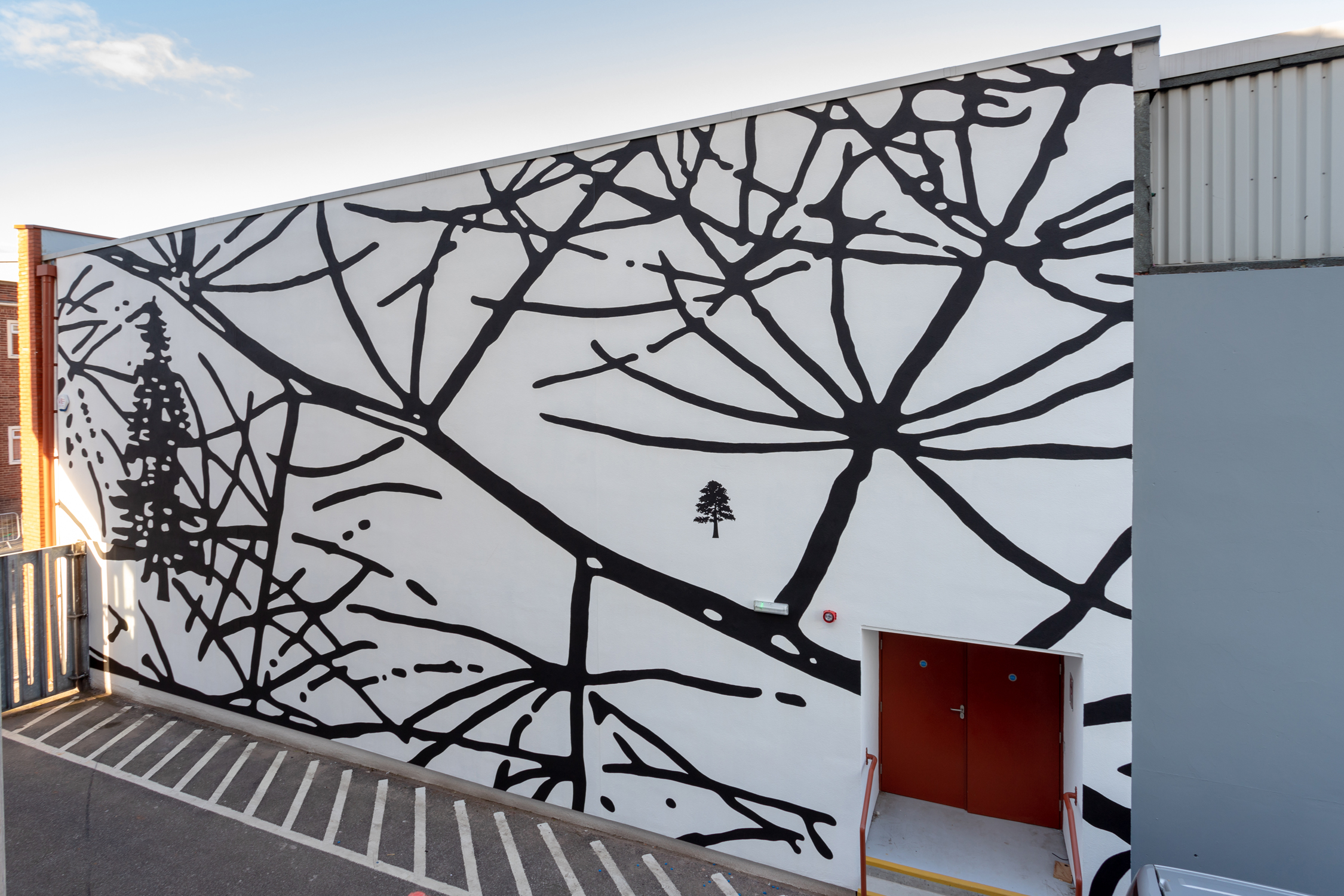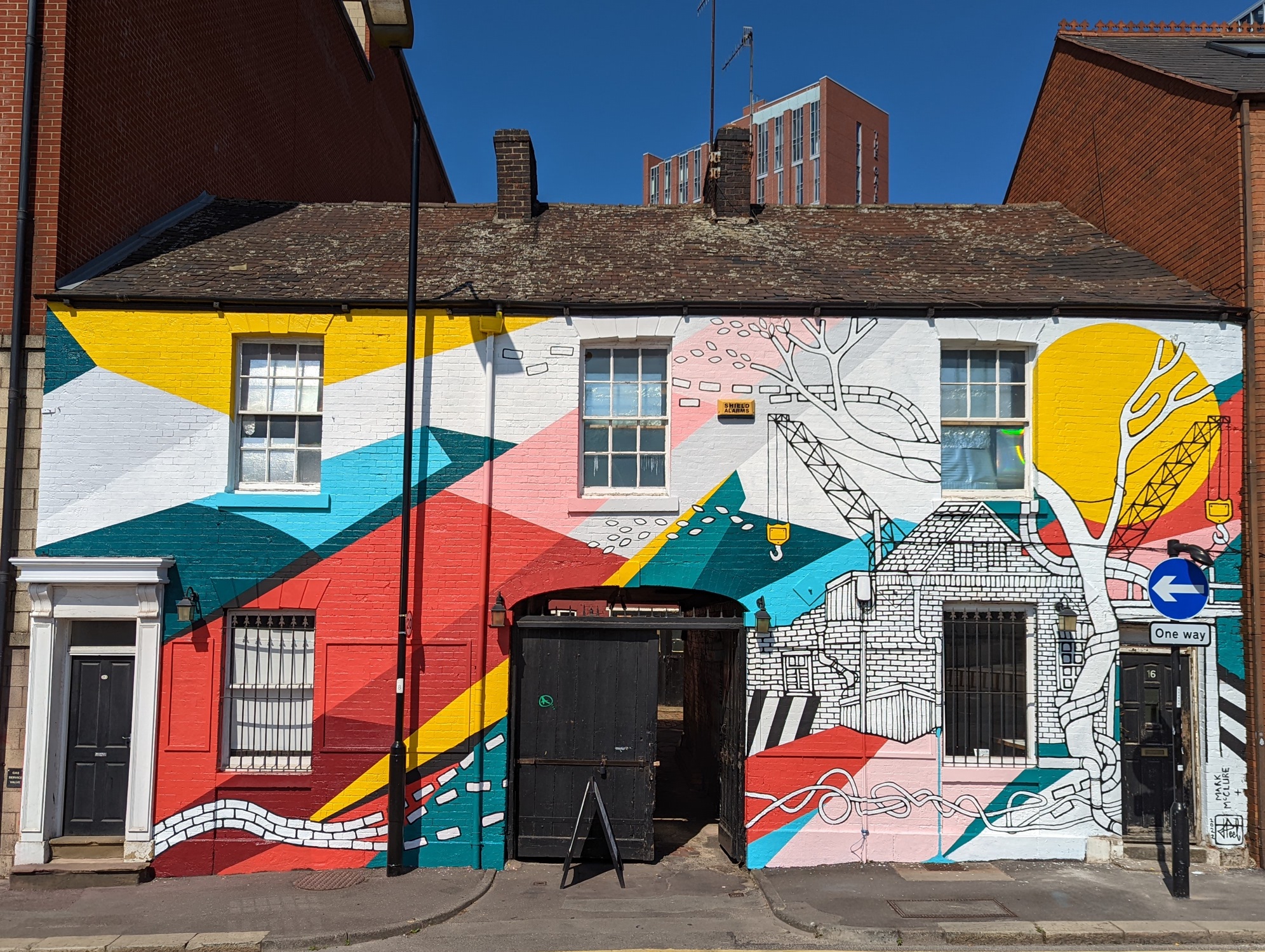 2. All across the gallery's front, this mural mixes work by two prolific artists. A monochrome nature and construction scene recognisable as Sheffield’s Jo Peel meets the bold geometry of London-based Mark McClure. From Murals Across the CIQ in 2022.