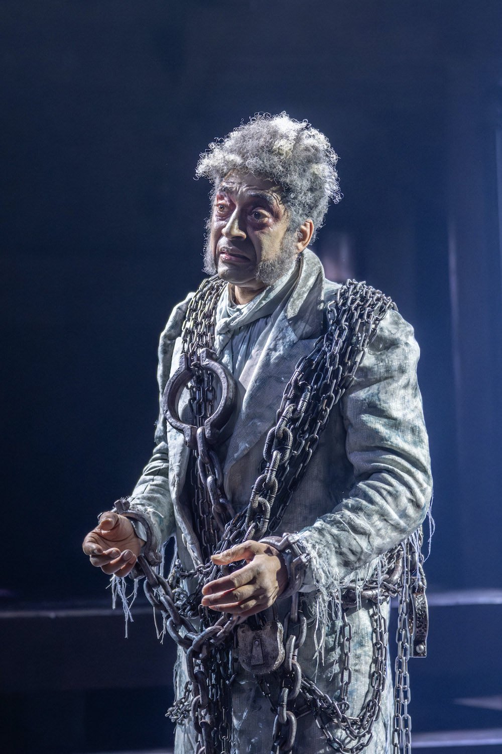 But it’s in the delightfully eccentric moments that A Christmas Carol truly shines. From a flamboyant Ghost of Christmas Present who whips the audience with wrily dry wit, to figures suddenly appearing through doors, on stage after blackouts, on the stairs and any other crevice of the Crucible that an actor can stow away in! Adding to the at times frantic nature of production, it's a clever way to combat a historically sleepy-at-times source material.