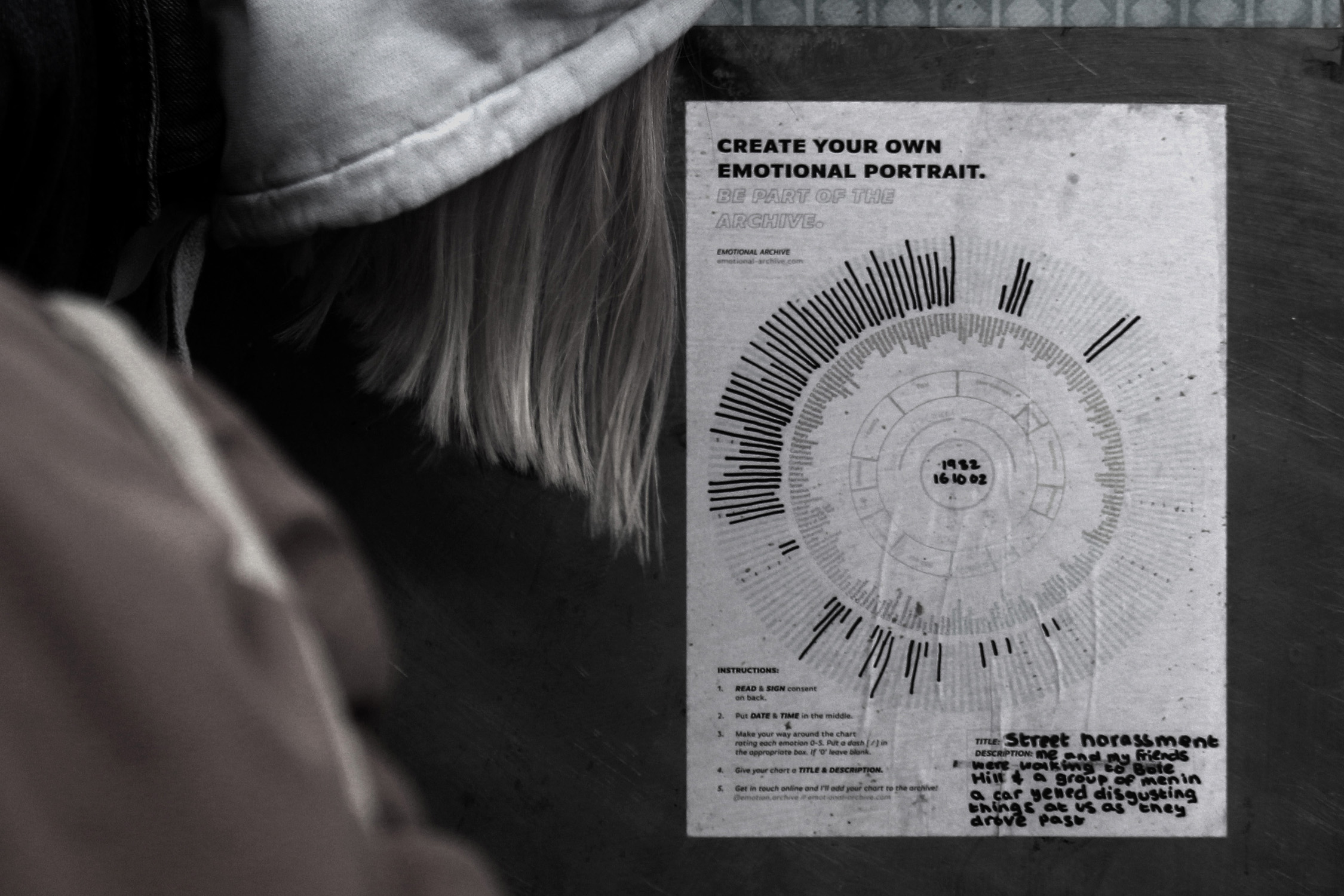 Our Bodies Our Streets is a campaign founded by students in Sheffield, aiming to tackle the issue of catcalling and street harassment. The group has been mapping catcalling incidents experienced by its supporters. For this collaboration, they distributed Philip’s emotional charts for participants to fill in anonymously, to document the experience of harassment from the targets’ perspectives.