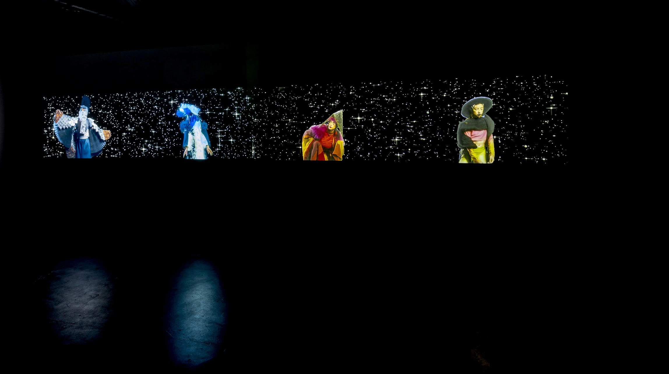 An amazing show of colourful costumed characters moved into archetype-like Chinese mythological characters, embodying elements of traditional Chinese medicine: fire, earth, metal and water. Wood was also present in crafted origami-style folded papers, fan-like wings that also brought the winds of change. In this dreamlike space I began to feel like I could inhabit the suspended costumes, to move and dance slowly, mindfully, with the images that appeared on the films in front of me.