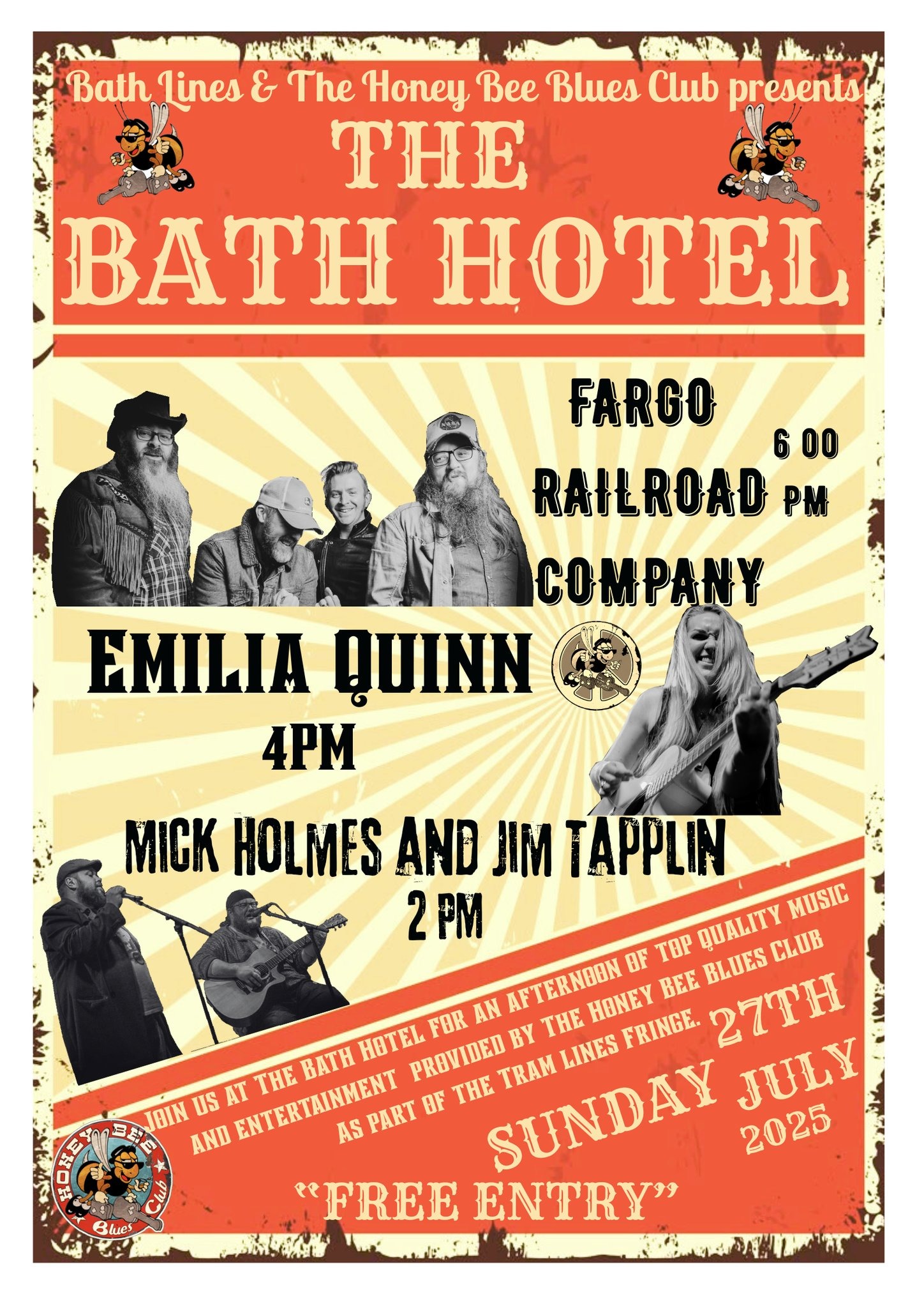 This time it's the turn of The Bath Hotel, where together with Honey Bee Blues Club they're presenting Bath Lines from 2pm. First up are two big blokes with one big sound that is Mick Holmes and Jim Tapplin, followed by the extrodinary singing and writing talent that is Emilia Quinn, and closing with southern rock quartet The Fargo Railroad Co.