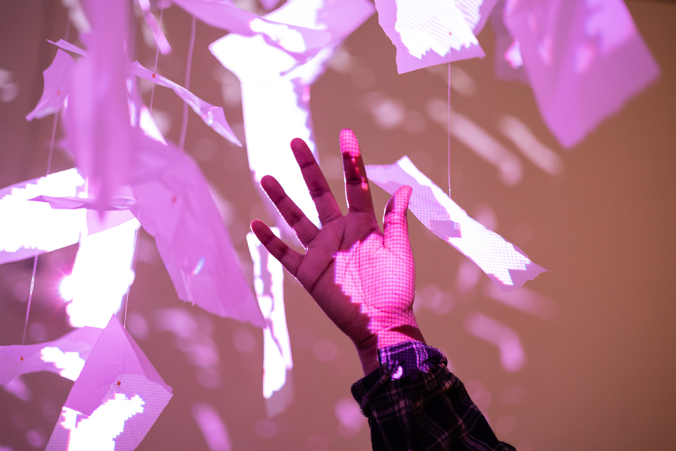 On entering the gallery you are met with the spinning, ethereal wonderment of a piece called distant by Seiko Kinoshita. Tracing paper and fishing line dance in the projected light and convey a sense of longing and loss. The artist's use of craft to install a sense of connection is clear to witness. Ever shifting, the pattern of the projection is never quite realised. A metaphor for the proximity and distance of grief. In Seiko’s other work, shuttle, the data ghost of a forgotten sound is preserved through the mimicry of the industrial loom of her departed friend. This confluence of the digital and artisanal heralds a new direction for the research element of her exploration at Platform 21.