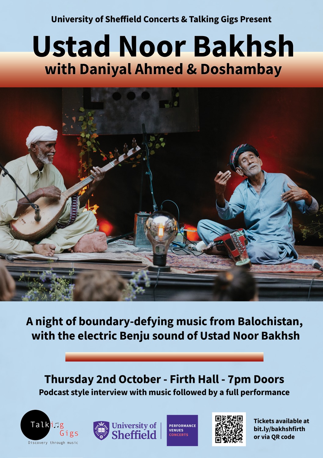 In the Talking Gigs first half you’ll hear about the remarkable story of Ustad Noor’s rise from rural Pakistan (Balochistan) to sell out European tours, and complemented by musical pieces that give context to the interview. You'll also learn about the musicians and their instruments particularly Ustad Noor’s electrified Balochi Benju. The second half will be an all music performance. And... dancing is definitely encouraged.