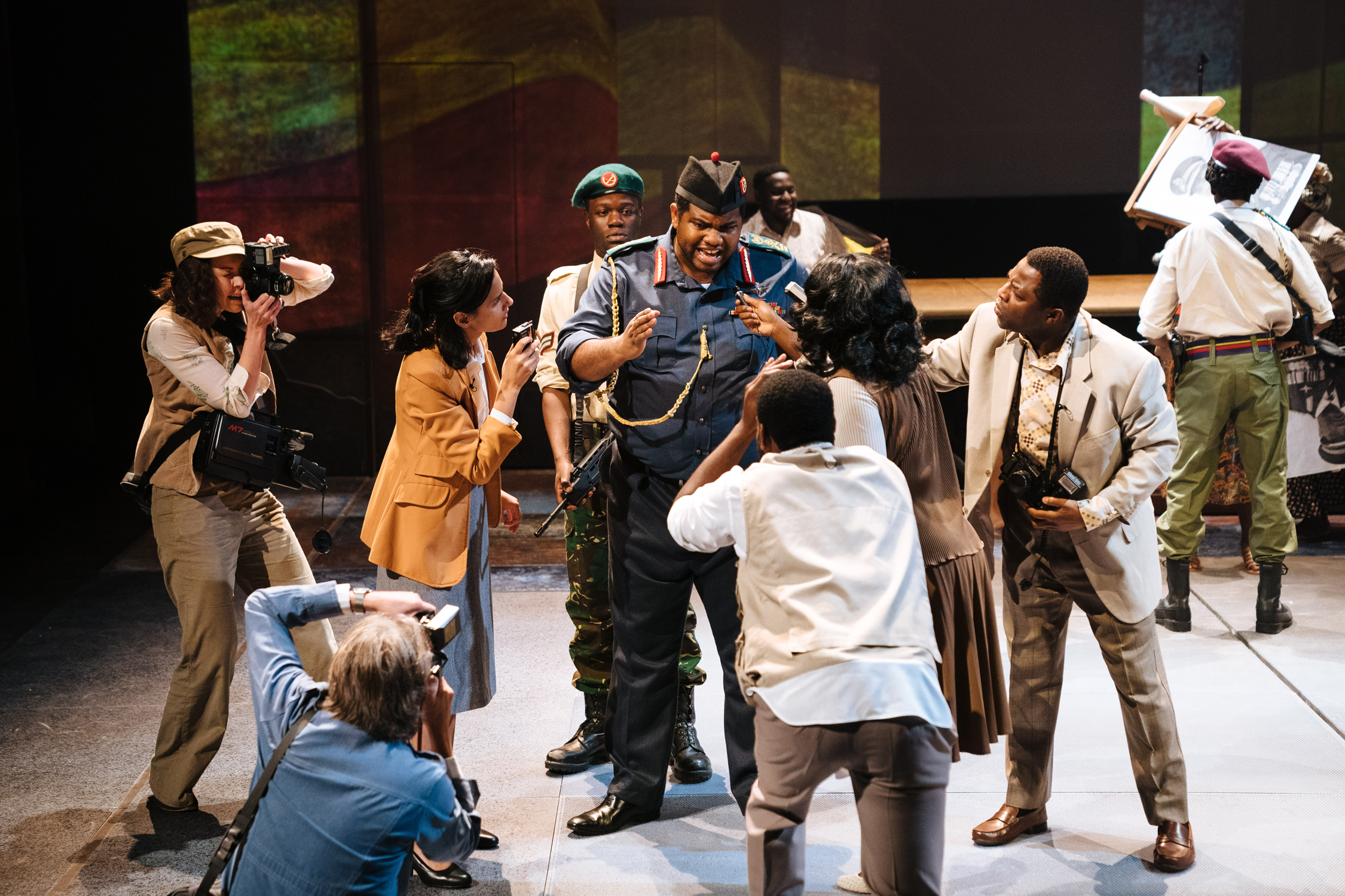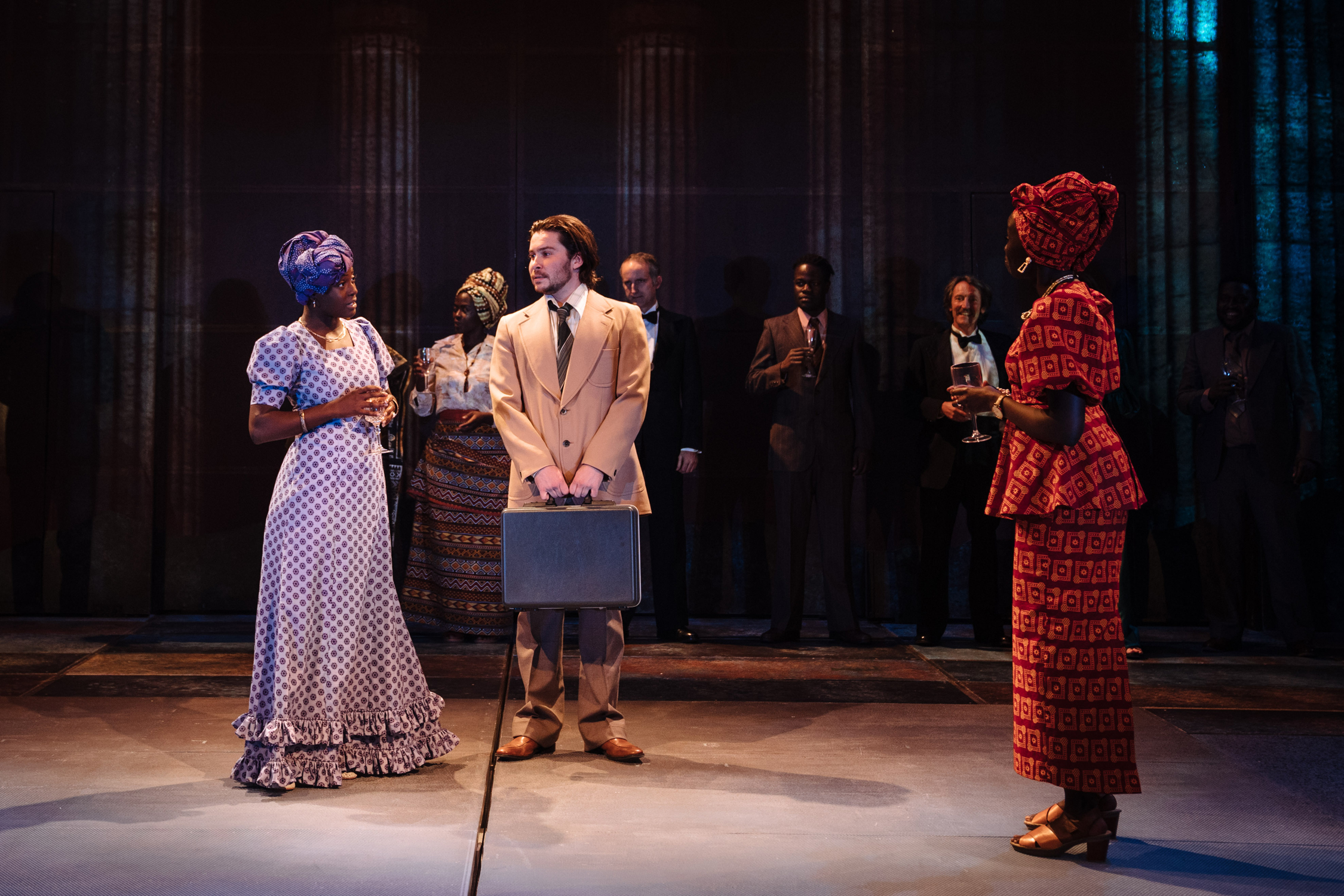 The performance is anchored by Tobi Bamtefa as Idi Amin and Daniel Portman as his physician, Nicholas Garrigan. Bamtefa’s Idi Amin is larger-than-life on all fronts - he’s booming, gregarious and often comic, then chilling in his thirst for power and violence. Bamtefa depicts both the magnetism and the inherent danger of a leader with this big of an ego. Daniel Portman delivers a passionate performance as Nicholas Garrigan, who begins as a seemingly naïve helper to the leader, but quickly finds himself slipping further and further into the regime, eventually becoming complicit in its brutality. Alongside the two main characters come quietly confident performances from Akuc Bol as one of the President’s wives Kay Amin and John Omole as doctor Peter Mbalu-Mukasa, with the pair secretly in love and due to have a child. It is their desperate plea for Nicholas Garrigan’s help that brings the real danger of Idi Amin to Garrigan’s own door for the first time. Support is also lent to the cast by members of the Sheffield People’s Theatre, who add welcome life and vibrancy.