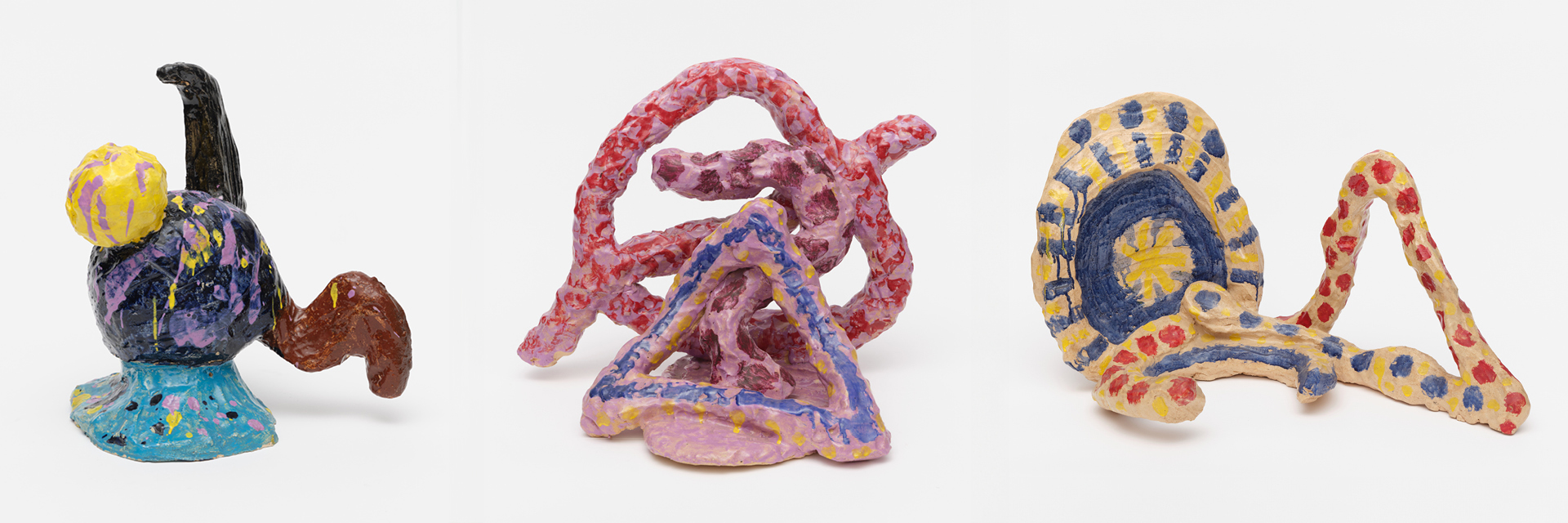 The featured artists share a common fascination and appreciation for colour, materiality, and creative process. They work with materials ranging from cement or synthetic fabric to glitter, combining human and animal bodies, furniture, everyday objects and architecture into playful, bold, new sculptural hybrids.