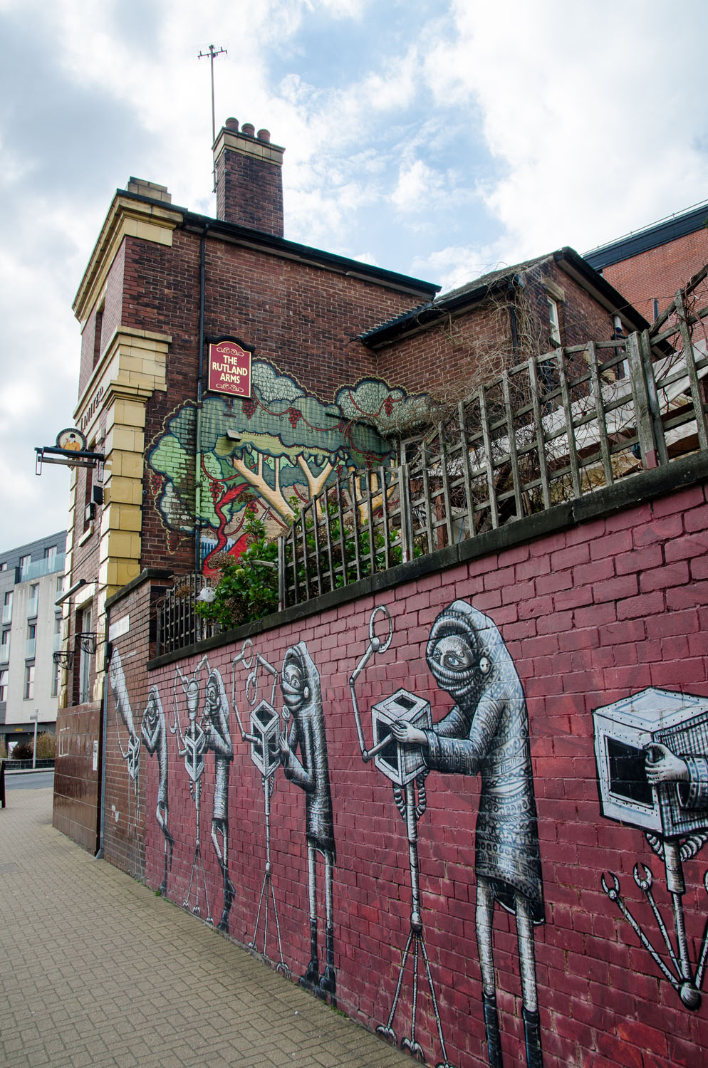 Austrian artist Frau Isa came to town for the Feature Walls street art festival in 2016, leaving behind an alluring and quietly arresting portrait of a bookish girl and her dog on the side of the Red Deer – which is why this excellent pub is one of the stops on our street art pub crawl.